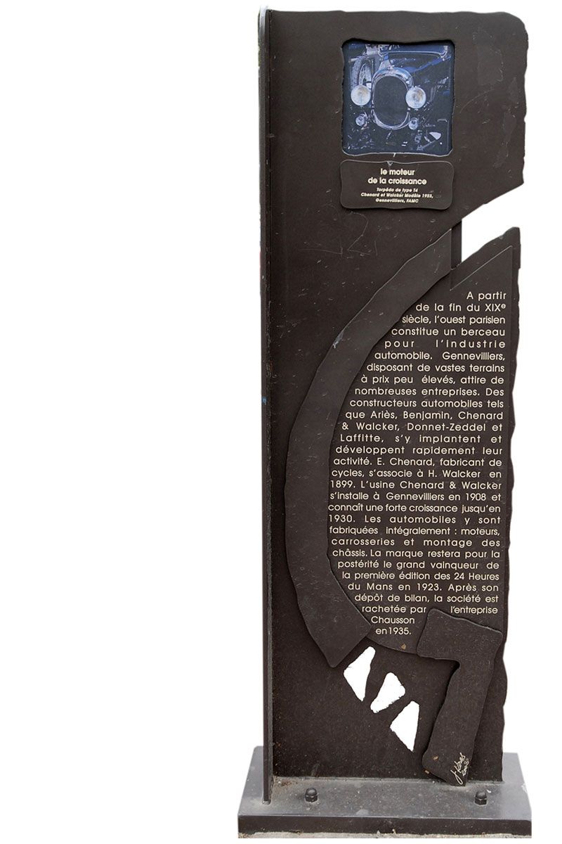 E. Chenard, fabricant de cycles, s’associe à H. Walcker en 1899. L’usine Chenard & Walcker s’installe à Gennevilliers en 1908 et connaît une forte croissance jusqu’en 1930. Les automobiles y sont fabriquées intégralement : moteurs, carrosseries et montage des châssis.